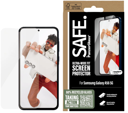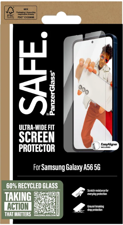 SAFE. is for real. SAFE. is for you. SAFE. is for dance floor mishaps, selfies gone wrong and your everyday fumbling, dropping and screen cracking. This SAFE. by PanzerGlass®️ screen protector made of 60% recycled material acts as a discrete airbag, protecting your phone by absorbing impacts and providing high-level scratch resistance without compromising the functionality and look of your device. It even has a smudge-free coating that reduces traces of fingerprints and grease.