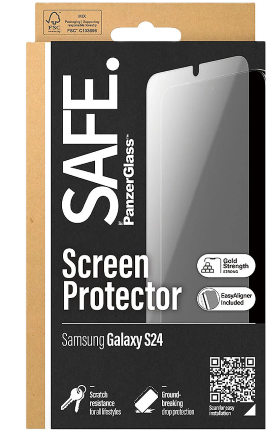 SAFE. is for real. SAFE. is for you. SAFE. is for dance floor mishaps, selfies gone wrong and your everyday fumbling, dropping and screen cracking. This SAFE. by PanzerGlass™️ screen protector for Samsung Galaxy S24 5G, made of 60% recycled material acts as a discrete airbag, protecting your phone by absorbing impacts and providing high-level scratch resistance without compromising the functionality and look of your device. It even has a smudge-free coating that reduces traces of fingerprints and grease and ensures 100% compatibility with your screen’s ultrasonic fingerprint reader.