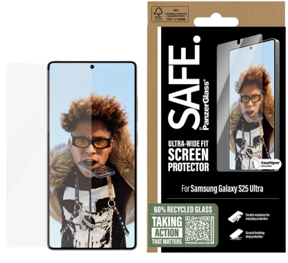 SAFE. is for real. SAFE. is for you. SAFE. is for dance floor mishaps, selfies gone wrong and your everyday fumbling, dropping and screen cracking. This SAFE. by PanzerGlass®️ screen protector made of 60% recycled material acts as a discrete airbag, protecting your phone by absorbing impacts and providing high-level scratch resistance without compromising the functionality and look of your device. It even has a smudge-free coating that reduces traces of fingerprints and grease and ensures 100% compatibility with your screen’s ultrasonic fingerprint reader. Can you feel it? Love is in the air. Love for phones and the planet. It’s the new circle of phone life. When you keep your beloved phone SAFE., you can one day pass it on to another phone lover who will love it just as much as you do. Choose SAFE. and give your phone a second, third or fourth life! This is one way of working toward a more sustainable future! Another is to use less and less and LESS packaging: For this screen protector, we’ve reduced the paper packaging by 33%*. And like all our products, it comes in a recyclable FSC™-certified box. Everybody deserves to be SAFE. Without hassle, red tape, or unnecessary complexity. This screen protector comes with an EasyAligner that makes installation a piece of cake (seriously!) and to make it even easier, we’ve included step-by-step instructions as well as a QR code for quick access to our online how-to video. And remember: You just need to install the screen protection once! Then you’ll never again fear the sight of your phone tumbling to the ground screen first. This may not happen, but if it does, you’ll regret not having clicked “add to cart”. No screen protection is worth poor screen performance! That’s why this screen protector comes in Ultra-Wide Fit, meaning it covers the front surface of your phone, providing a complete and crystal-clear view of your screen. It even leaves a little room around the edges to give you the freedom to upgrade your protection with a SAFE. by PanzerGlass case. And if you want 360-degree protection, combine the screen protector and case with a SAFE. by PanzerGlass® camera lens protector. Keep your phone SAFE. *Measured by third-party lab by comparing the mass of the new paper packaging introduced in 2023 with the mass of the previous paper packaging introduced in 2022