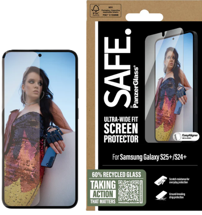SAFE. is for real. SAFE. is for you. SAFE. is for dance floor mishaps, selfies gone wrong and your everyday fumbling, dropping and screen cracking. This SAFE. by PanzerGlass®️ screen protector made of 60% recycled material acts as a discrete airbag, protecting your phone by absorbing impacts and providing high-level scratch resistance without compromising the functionality and look of your device. It even has a smudge-free coating that reduces traces of fingerprints and grease and ensures 100% compatibility with your screen’s ultrasonic fingerprint reader. Can you feel it? Love is in the air. Love for phones and the planet. It’s the new circle of phone life. When you keep your beloved phone SAFE., you can one day pass it on to another phone lover who will love it just as much as you do. Choose SAFE. and give your phone a second, third or fourth life! This is one way of working toward a more sustainable future! Another is to use less and less and LESS packaging: For this screen protector, we’ve reduced the paper packaging by 33%*. And like all our products, it comes in a recyclable FSC™-certified box. Everybody deserves to be SAFE. Without hassle, red tape, or unnecessary complexity. This screen protector comes with an EasyAligner that makes installation a piece of cake (seriously!) and to make it even easier, we’ve included step-by-step instructions as well as a QR code for quick access to our online how-to video. And remember: You just need to install the screen protection once! Then you’ll never again fear the sight of your phone tumbling to the ground screen first. This may not happen, but if it does, you’ll regret not having clicked “add to cart”. No screen protection is worth poor screen performance! That’s why this screen protector comes in Ultra-Wide Fit, meaning it covers the front surface of your phone, providing a complete and crystal-clear view of your screen. It even leaves a little room around the edges to give you the freedom to upgrade your protection with a SAFE. by PanzerGlass case. And if you want 360-degree protection, combine the screen protector and case with a SAFE. by PanzerGlass® camera lens protector. Keep your phone SAFE. *Measured by third-party lab by comparing the mass of the new paper packaging introduced in 2023 with the mass of the previous paper packaging introduced in 2022