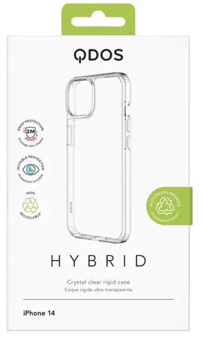 Protect your iPhone 13/14 while preserving the environment! This ultra-transparent HYBRID case is made from 100% recycled polycarbonate, used to create the rigid back, and 100% recycled TPU which forms the flexible frame. The result: maximum protection for your iPhone 13/14, thanks to a scratch resistance finish, air-cushioned corners to absorb falls (up to 2 meters) and slightly raised edges around the screen to prevent scrapes and scratches. It also provides maximum protection for the environment, thanks to its' eco-conscious design and FSC packaging. Compatible with wireless charging and OptiGuard® screen protectors.