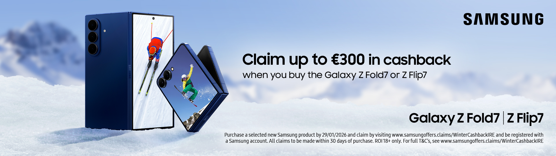 Purchase a Selected new Samsung product by 29/01/2026 and claim by visiting samsungoffers.claims/WinterCashbackIREand be registered with a Samsung account. All claims to be made within 30 days of purchase. ROI 18+ only. For full T&C’s, See samsungoffers.claims/WinterCashbackIRE